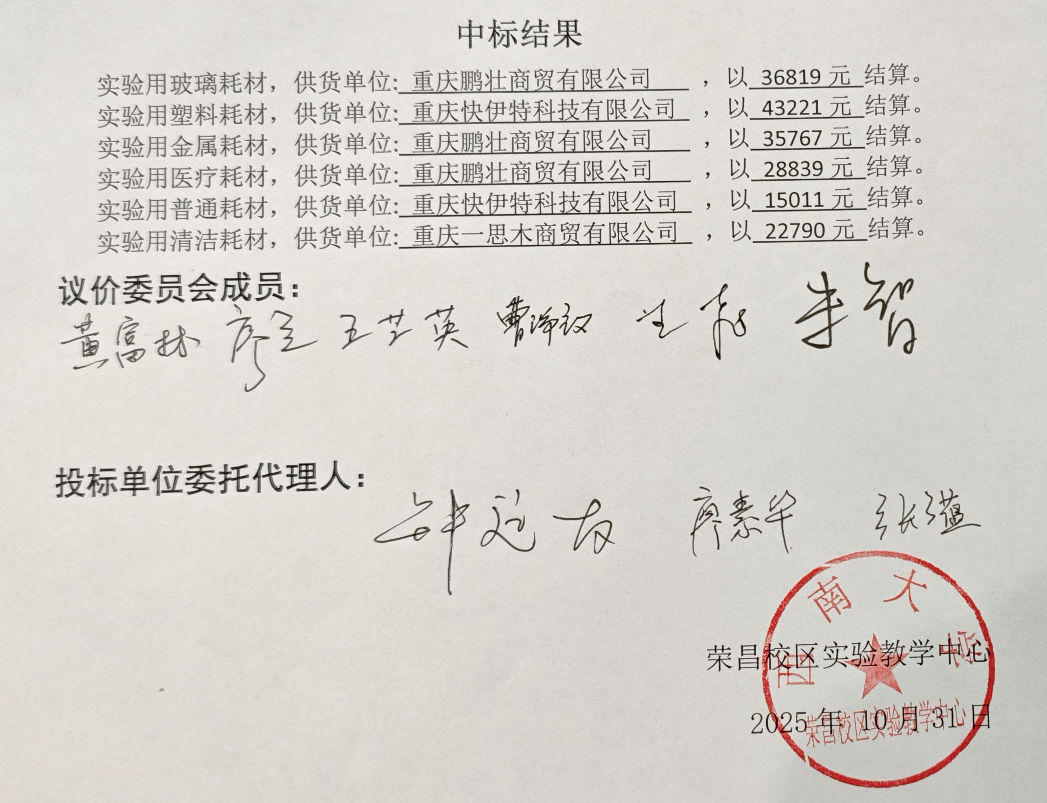 实验教学中心实验耗材采购中标结果公示