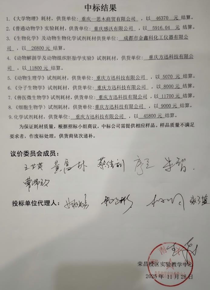 实验教学中心实验耗材采购中标结果公示